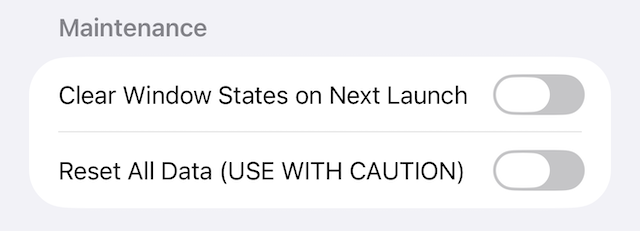 Clears all stored window states when the app is next launched. This is useful for recovering from crashes caused by corrupted window state data. The setting is automatically turned off after the window states are cleared.